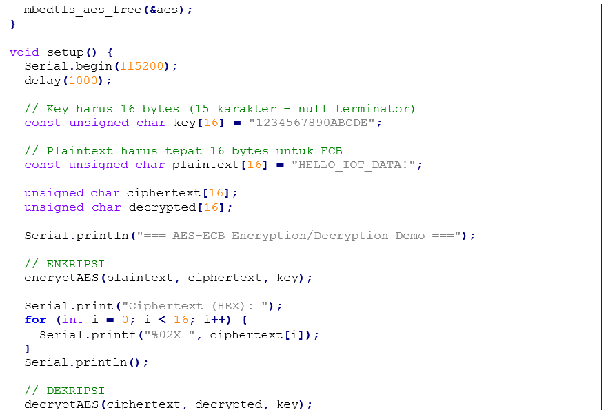 Enkripsi data bertujuan untuk melindungi informasi dari pihak yang tidak berwenang dengan cara mengubah data asli (plaintext) menjadi bentuk tidak terbaca (ciphertext). Dalam sistem IoT, enkripsi diperlukan pada tiga kondisi yaitu: