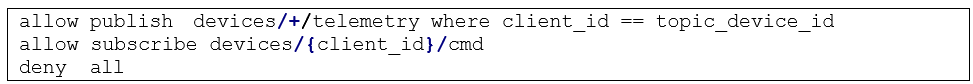 Dalam sistem IoT berbasis MQTT, otorisasi dilakukan pada tingkat topic. Setiap perangkat hanya boleh, Publish ke topik miliknya (devices/<id>/telemetry) dan Subscribe ke topik perintah (devices/<id>/cmd). Berikut contoh kebijakan sederhana (pseudo-ACL):