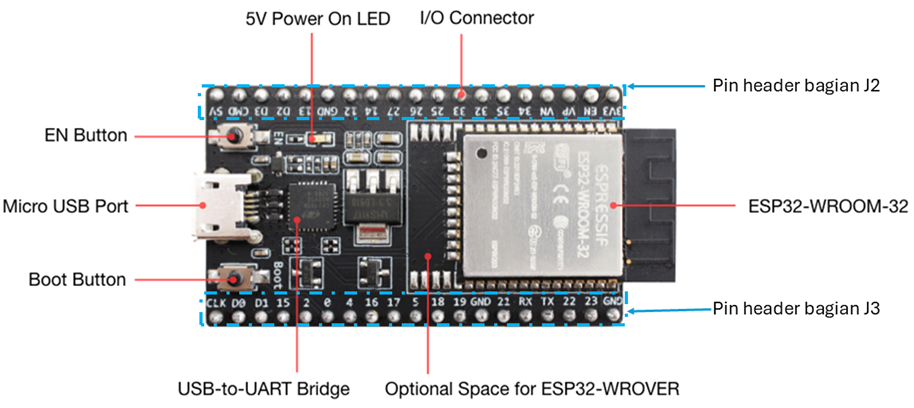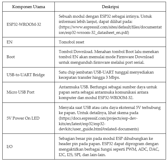 ESP32 memiliki banyak seri, pada materi haya dibahas ESP32 Series karena seri ini cukup umum digunakan. Gambar 1. menunjukkan bentuk dari ESP32-DevKitC V4 yang menggunakan modul ESP32-WROOM-32. Komponen utama dari DevKit ini dapat dilihat pada Tabel 1.