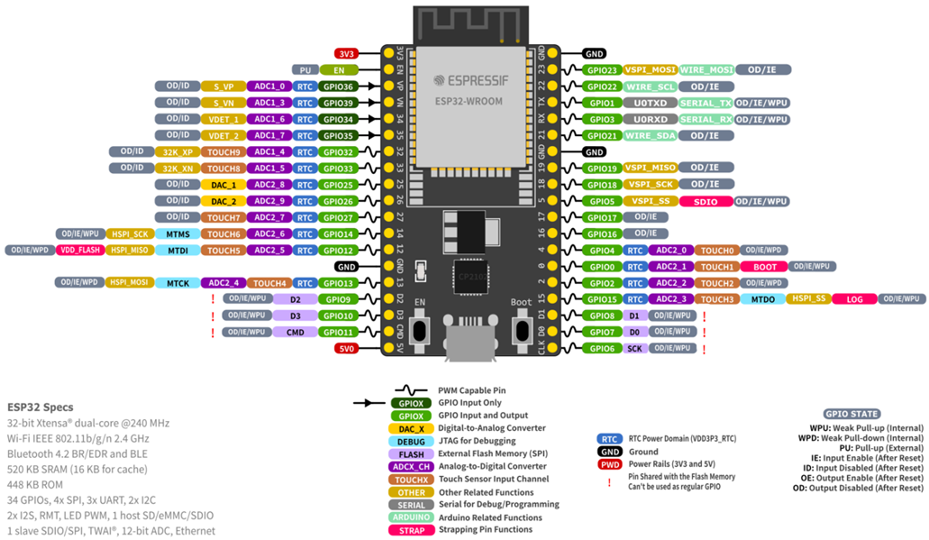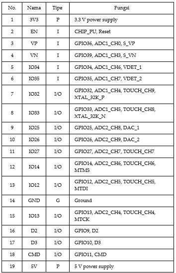 Tabel 2. dan Tabel 3. menyajikan nama dan fungsi setiap pin header I/O pada kedua sisi papan (J2 dan J3). Pada Gambar 2. menunjukkan tata letak dari Pin ESP32-DEVKitC secara lebih rinci, bagian pin header J2 ditunjukkan pada bagian kiri dan bagian J3 ditunjukkan bagian sebelah kanan.