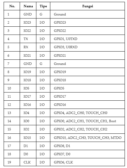 Selian itu terdapat pin CMD atau singkatan dari Command Pin yang digunakan pada antarmuka SDIO (Secure Digital Input Output) di ESP32. Pin ini berfungsi sebagai jalur komunikasi perintah ketika ESP32 berinteraksi dengan perangkat SD card atau modul lain yang mendukung SDIO. Dalam protokol SDIO, terdapat tiga jenis jalur utama, yaitu: CLK (Clock) yang berfungsi memberikan sinyal sinkronisasi ke seluruh bus, CMD (Command) dipakai untuk mengirim perintah dari host (ESP32) ke slave (misalnya SD card) dan menerima respon balik, serta DATA0 sampai dengan DATA3 merupakan jalur data untuk mengirimkan informasi.