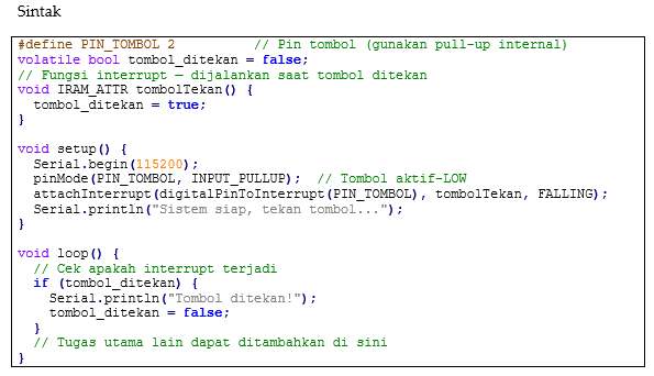 1. ISR (Interrupt Service Routine): Fungsi khusus yang dieksekusi saat interrupt dipicu. ISR harus singkat dan efisien. Berikut adalah contohnya: