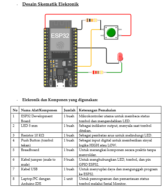 Seluruh sinyal dikategorikan menjadi dua kondisi logika, yaitu HIGH dan LOW. Logika HIGH menunjukan kondisi aktif atau ON dengan tegangan sekitar 3,3 V, sedangkan logika LOW merepresentasikan kondisi tidak aktif atau OFF dengan tegangan mendekati 0 V (GND). Ketika sebuah pin GPIO dikonfigurasi sebagai input, ESP32 akan membaca level tegangan pada pin tersebut dan menerjemahkannya menjadi logika 1 atau 0. Sebaliknya. Konsep logika biner ini banyak diterapkan dalam sistem digital. Sebagai output, mikrokontroler dapat mengontrol LED, relay, buzzer, dan solenoid. Sebagai input, mikrokontroler dapat membaca status tombol, sensor proximity, sensor magnetik, atau limit switch. ESP32 juga mendukung beberapa mode konfigurasi pin, seperti INPUT, OUTPUT, INPUT_PULLUP, dan INPUT_PULLDOWN, yang memberikan fleksibilitas dalam desain sistem.