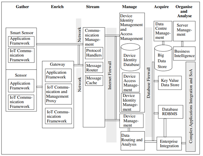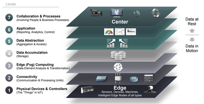 - Collaboration and Processes: Bagian ini berhubungan dengan interaksi manusia, dimana data IoT yang sudah diproses dapat dimanfaatkan untuk pengambilan keputusan.