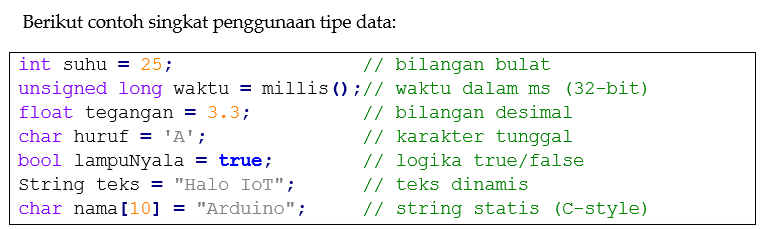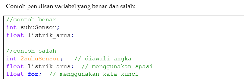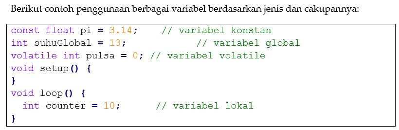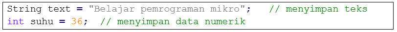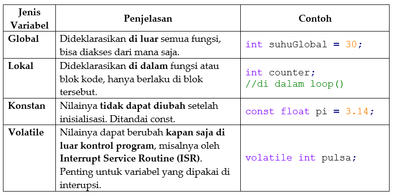 Variabel adalah sebuah penyimpan nilai yang dapat digunakan dalam program. Variabel dapat di rubah sesuai dengan instruksi yang kita buat. Fungsinya seperti wadah atau label yang memudahkan pemanggilan nilai tanpa harus mengetahui alamat memori sebenarnya. Ketika mendeklarasikan variabel harus diikut sertakan tipe variabel serta nilai awal variabel. Tujuan utama dari diperlukannya variabel untuk menyimpan nilai sementara (misalnya data sensor, atau inputan dari pengguna), melakukan manipulasi nilai (misalnya menghitung nilai sensor rata-rata atau hasil pembacaan sensor), dan melakukan penyalinan data agar data asli tetap utuh (misalnya suhu = nilai_sensor). Berikut adalah penggunaan variabel pada pemrograman mikrokontroler: