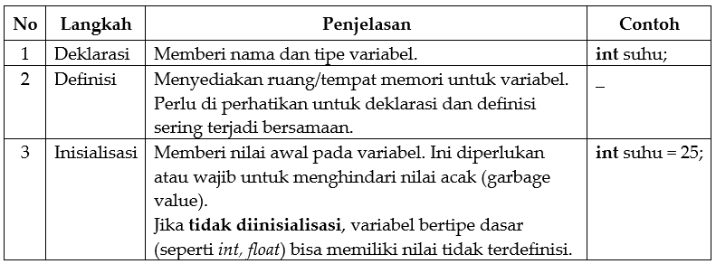 Pada bahasa pemrograman (Arduino), variabel harus melalui tiga langkah penting yaitu: