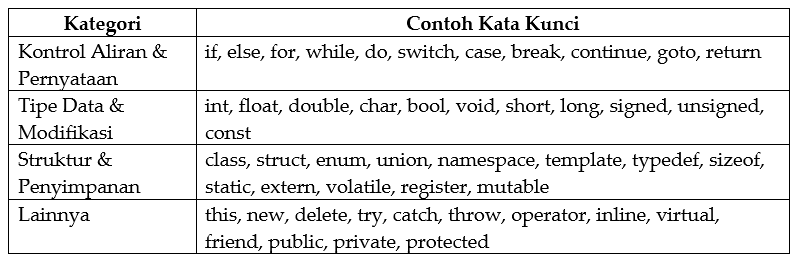 - Tidak boleh sama dengan kata kunci dari bahasa pemrograman (C++) seperti: