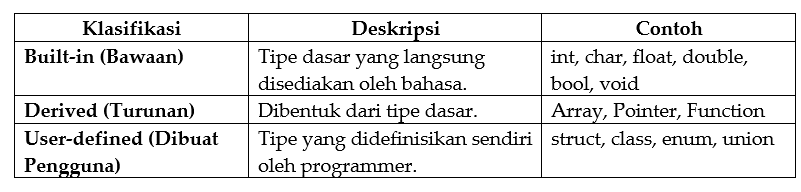 Tipe data adalah klasifikasi yang menentukan jenis nilai, ukuran memori, dan operasi yang diperbolehkan untuk suatu variabel. Ketika kode dikompilasi, compiler memerlukan informasi tipe data agar dapat menentukan berapa besar memori yang dicadangkan, dan memastikan operasi yang dilakukan sesuai tipe (misalnya penjumlahan hanya untuk angka), serta mengoptimalkan kecepatan dan efisiensi program. Perlu juga dicatat, jika tipe data hanya relevan saat kompilasi (compile time) dan pada saat program dijalankan (runtime) yang tersisa hanyalah nilai bukan tipenya.