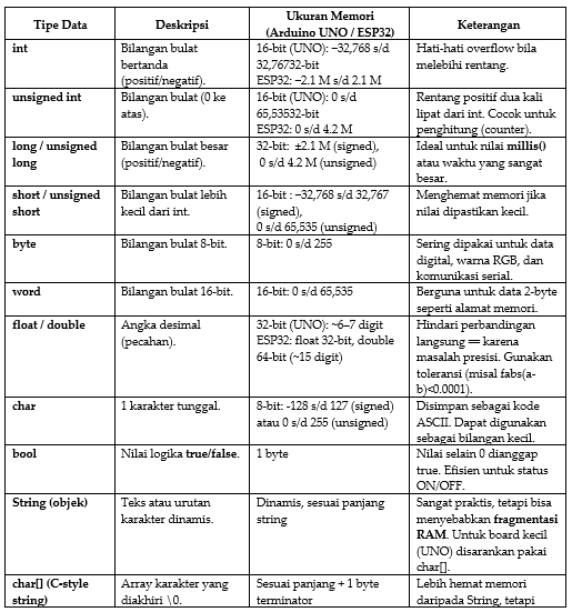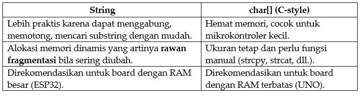 Dalam penggunaan tipe data, perhatikan perbedaan antara String (objek Arduino) dan char[] (C-style). Perbedaan utamanya dapat dilihat pada tabel berikut: