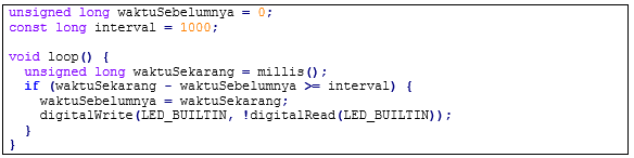 B. Metode Non-Blocking (Timer berbasis Waktu Sistem): Metode ini tidak menghentikan eksekusi program. Program dapat terus berjalan sambil menghitung waktu di latar belakang. Pada arduino menggunakan millis() yang berfungsi untuk mengembalikan jumlah milidetik sejak program mulai dijalankan dan dapat digunakan untuk membuat delay tanpa menghentikan program. Berikut adalah contoh programnya: