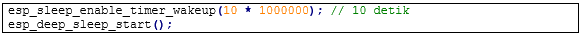 B. Sleep Timer: Digunakan dalam mode low-power (hemat daya), seperti pada perangkat berbasis baterai. Dengan konsep ESP32 masuk ke deep sleep, hanya RTC aktif dan setelah waktu tertentu, RTC Timer membangunkan sistem. Contohnya seperti berikut: