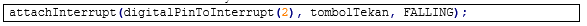 2. Attaching Interrupt: Parameter Attaching Interrupt pada mikrokontroler yaitu Pin untuk pin digital yang digunakan. ISR fungsi yang dipanggil dan Mode ada tiga RISING, FALLING dan CHANGE. Berikut contoh sintaknya: