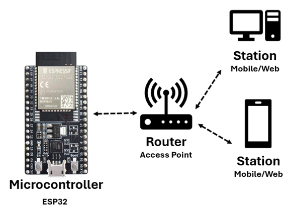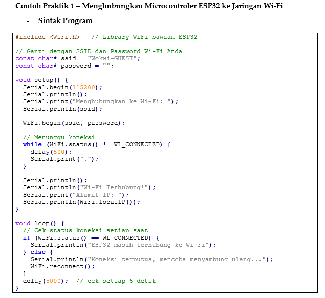 Pada ESP32 memiliki wi-fi yang merupakan fitur bawaan yang memungkinkan mikrokontroler ini terhubung ke jaringan nirkabel (wireless) tanpa modul tambahan. ESP32 memiliki transceiver Wi-Fi standar 802.11 b/g/n, sehingga dapat berfungsi sebagai station (terhubung ke router) maupun access point (membangun jaringan Wi-Fi sendiri). Dengan fitur ini, ESP32 dapat mengirim dan menerima data secara real-time melalui internet atau jaringan lokal, seperti mengirim data sensor ke server, menampilkan informasi di dashboard IoT (Web/Mobile), atau berkomunikasi dengan perangkat lain.