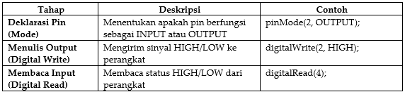 Setiap pin GPIO dapat dikonfigurasi sebagai Input berguna untuk membaca status logika dari perangkat eksternal (misal tombol atau sensor) dan Output berguna untuk mengirim sinyal logika untuk mengendalikan perangkat (misal LED atau relay). Fungsionalitas I/O Digital terbagi menjadi tiga langkah utama yaitu: