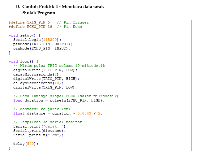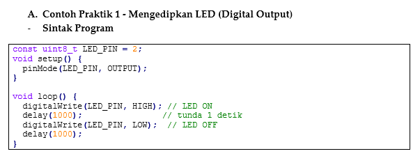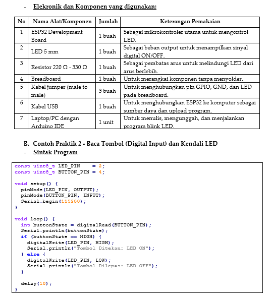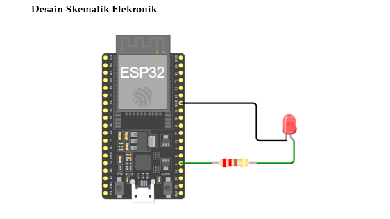 Dalam beberapa praktik, pin GPIO pada ESP32 dikonfigurasikan sebagai output untuk memberikan sinyal logika HIGH atau LOW, sehingga LED dapat menyala dan mati sesuai perintah program. Contoh ini membantu memahami cara kerja sinyal digital dalam mengendalikan perangkat elektronik secara langsung.