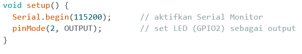Fungsi ini hanya dipanggil sekali saat program pertama kali dijalankan. Di bagian ini menempatkan inisialisasi awal sebelum program utama berjalan terus-menerus di loop(). Fungsi setup() harus di ikut sertakan dalam program walaupun tidak ada statement yang dijalankan.